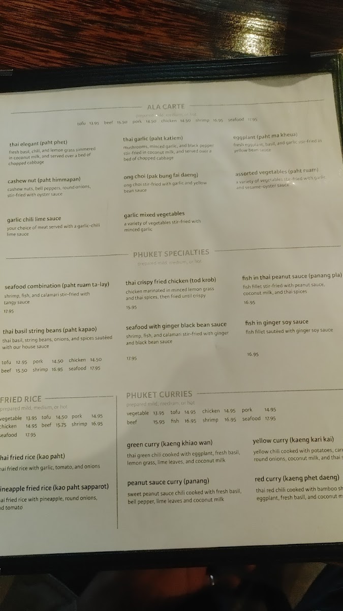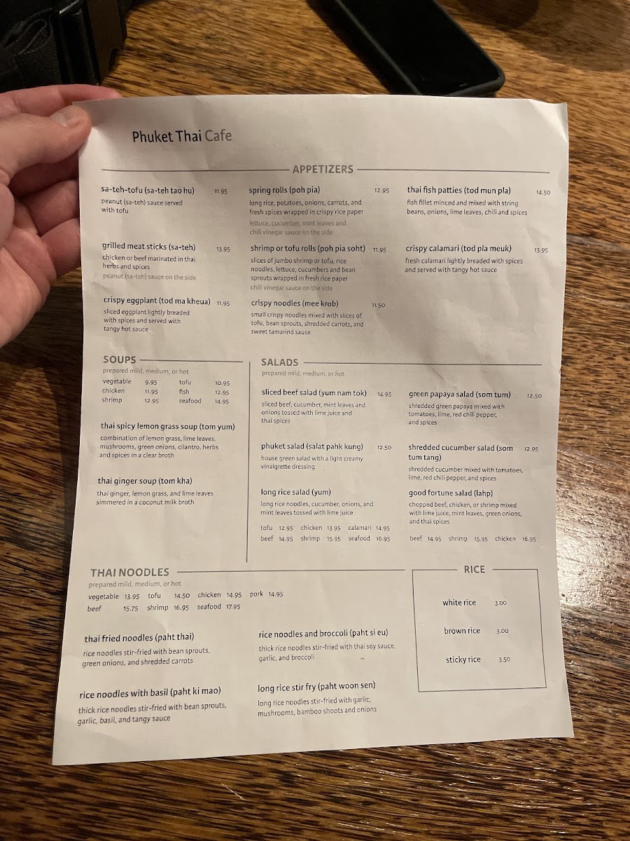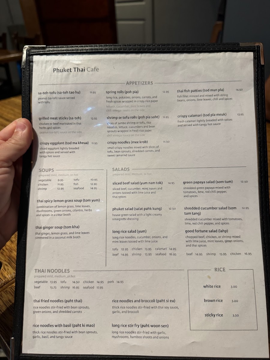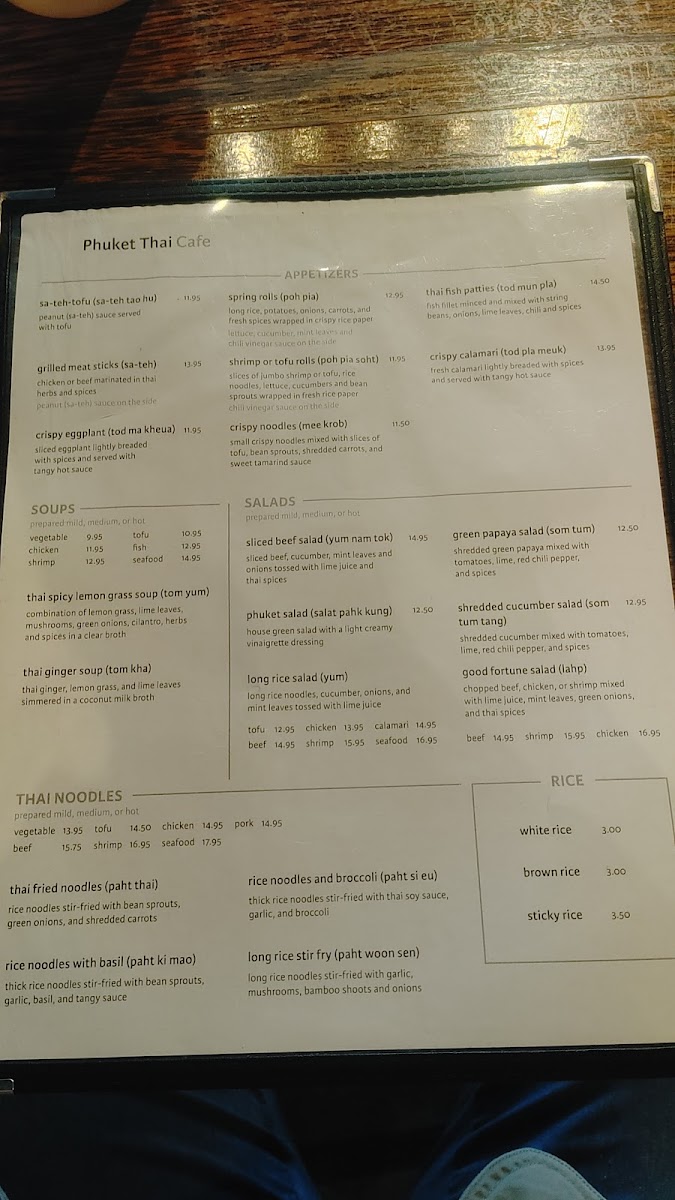 From a reviewer’s perspective, the menu at Phuket Thai Cafe offers a satisfying and well-rounded showcase of Thai cuisine, with a strong emphasis on variety across categories. The rice selections like Thai Fried Rice, Pineapple Fried Rice, and simple sides such as Sticky Rice Side and Brown Rice Side provide a solid base, while noodle dishes such as Thai Fried Noodles, Rice Noodles With Basil, and Long Rice Stir Fry deliver classic flavors with comforting depth. Appetizers like Spring Rolls, Grilled Chicken Sticks, and Shrimp Rolls set the tone, leading into hearty entrées including Cashew Nut, Thai Garlic, and Garlic Chili Lime Sauce dishes. The curry section stands out with staples like Green Curry, Red Curry, Yellow Curry, and Massaman Curry, appealing to both traditionalists and adventurous diners. Seafood lovers are well catered to with items like Seafood Lemongrass Soup, Fish In Ginger Soy Sauce, and Sweet & Sour Fish, while vegetarians have flavorful options such as Green Curry Tofu and Thai Ginger Mixed Vegetables. Salads like Phuket Salad With Shrimp and desserts such as Thai Sticky Rice With Coconut Milk & Ice Cream round out the experience nicely. Overall, the menu feels extensive yet cohesive, offering something for every preference while staying true to authentic Thai flavors.