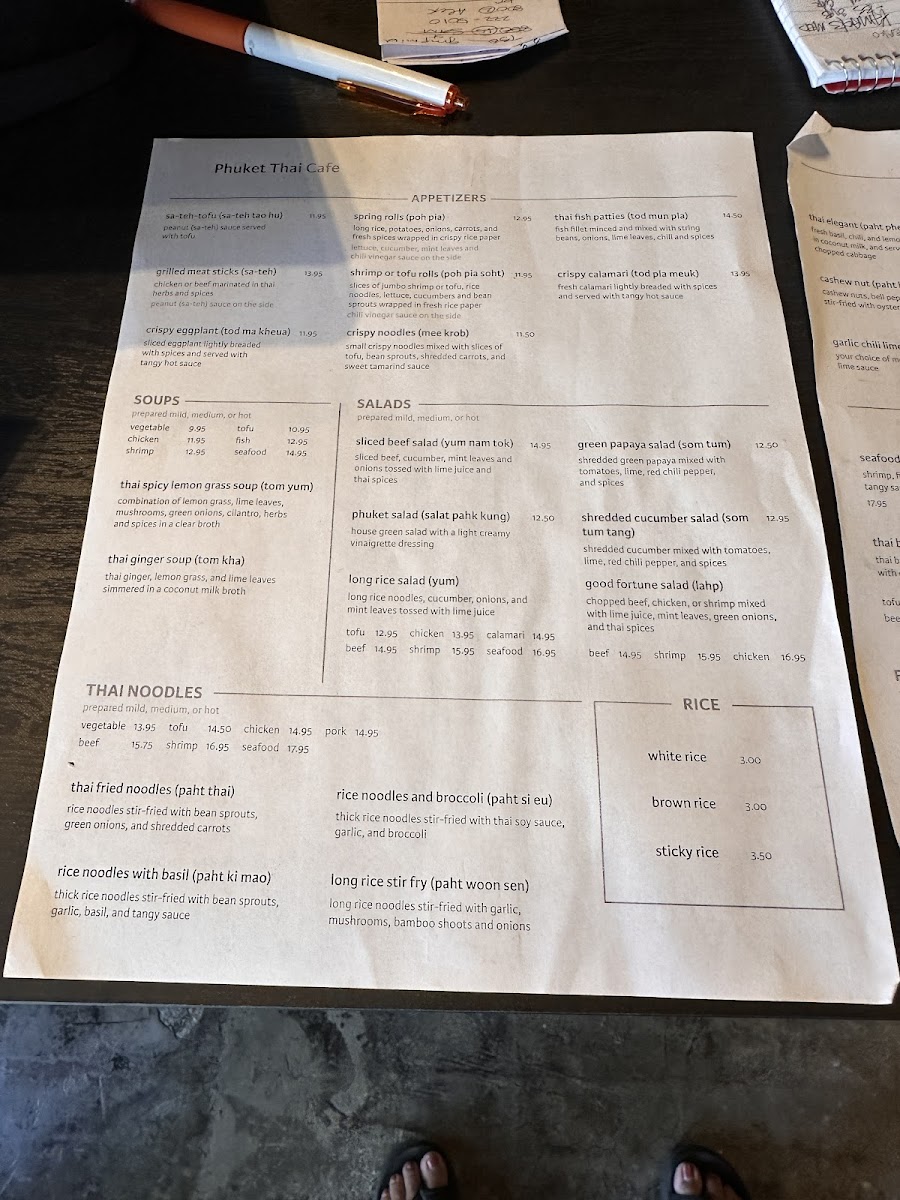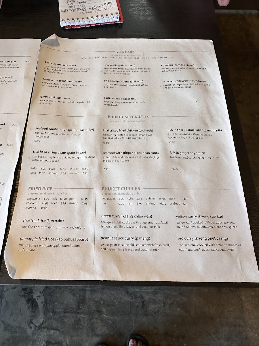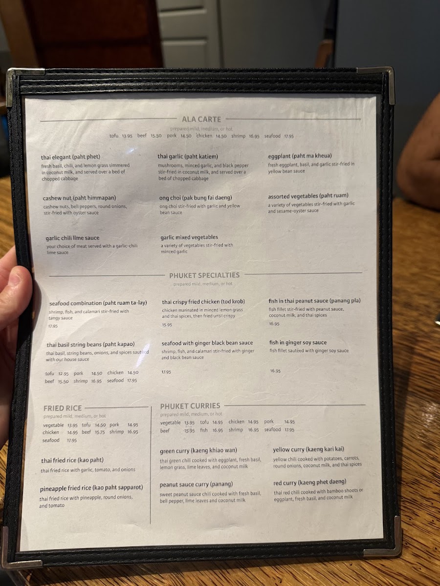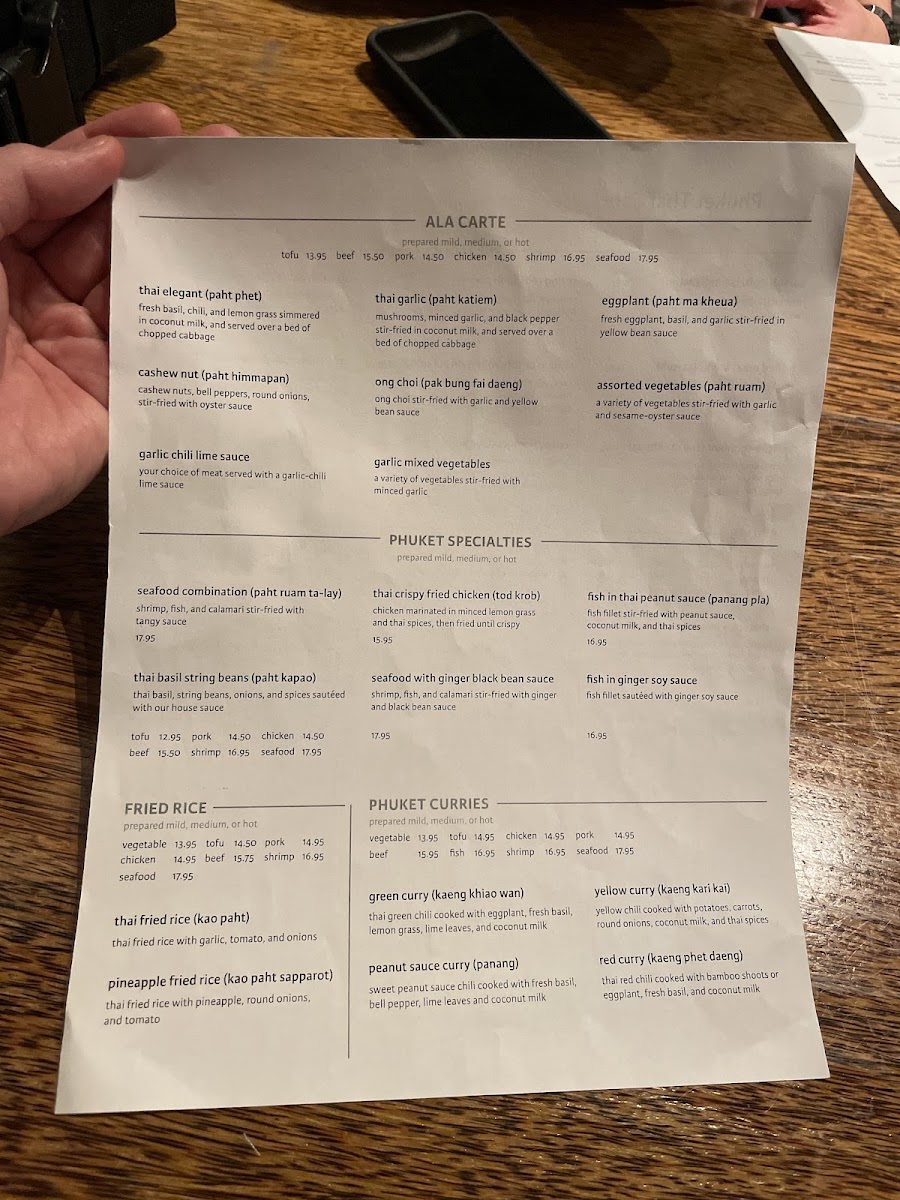 From a reviewer’s perspective, the menu at Phuket Thai Cafe offers a satisfying and well-rounded showcase of Thai cuisine, with a strong emphasis on variety across categories. The rice selections like Thai Fried Rice, Pineapple Fried Rice, and simple sides such as Sticky Rice Side and Brown Rice Side provide a solid base, while noodle dishes such as Thai Fried Noodles, Rice Noodles With Basil, and Long Rice Stir Fry deliver classic flavors with comforting depth. Appetizers like Spring Rolls, Grilled Chicken Sticks, and Shrimp Rolls set the tone, leading into hearty entrées including Cashew Nut, Thai Garlic, and Garlic Chili Lime Sauce dishes. The curry section stands out with staples like Green Curry, Red Curry, Yellow Curry, and Massaman Curry, appealing to both traditionalists and adventurous diners. Seafood lovers are well catered to with items like Seafood Lemongrass Soup, Fish In Ginger Soy Sauce, and Sweet & Sour Fish, while vegetarians have flavorful options such as Green Curry Tofu and Thai Ginger Mixed Vegetables. Salads like Phuket Salad With Shrimp and desserts such as Thai Sticky Rice With Coconut Milk & Ice Cream round out the experience nicely. Overall, the menu feels extensive yet cohesive, offering something for every preference while staying true to authentic Thai flavors.